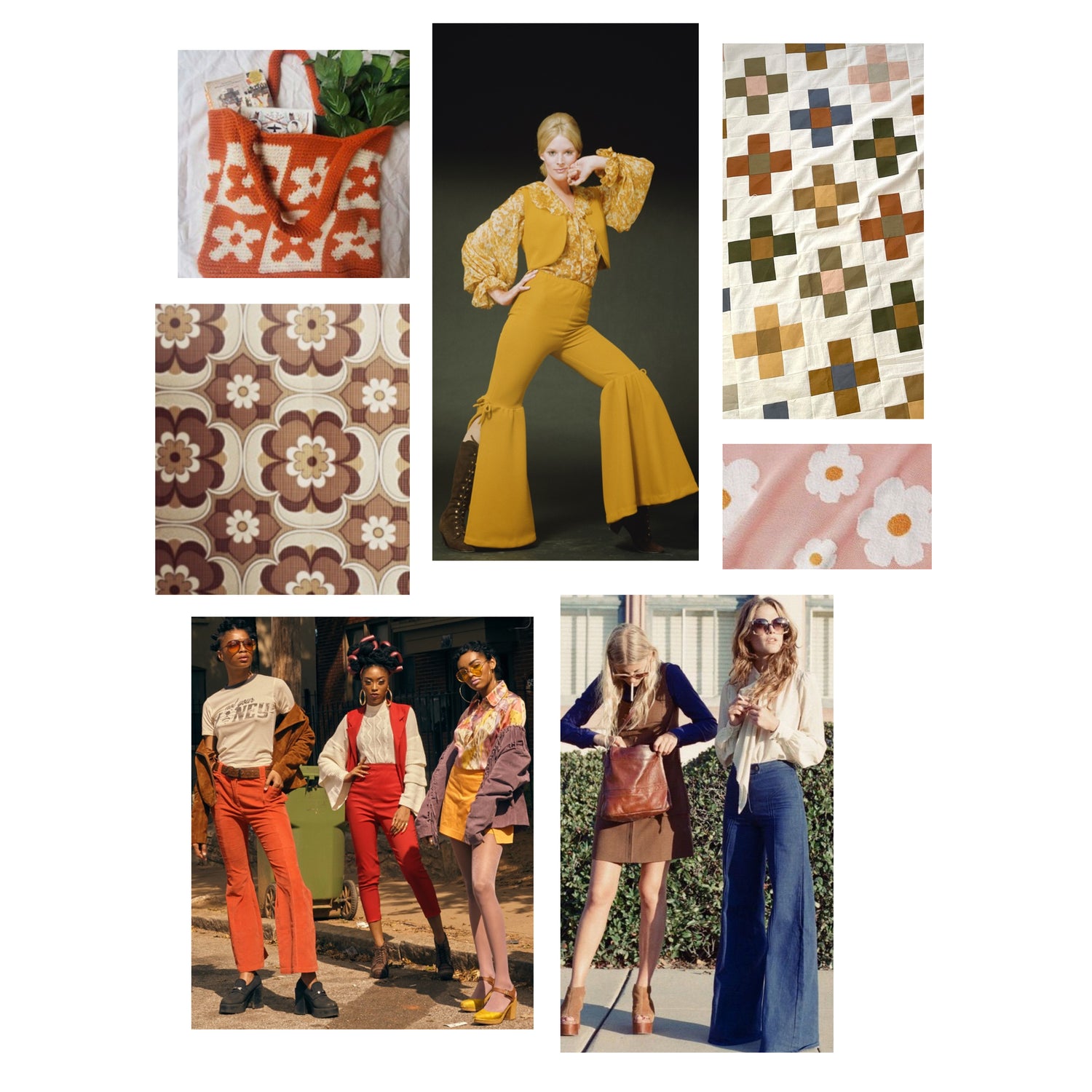 I began my design process by collecting many reference photos taken in the 70s or inspired by the decade. I was drawn to images that had the motifs, colors or vibe I was imagining for this collection.